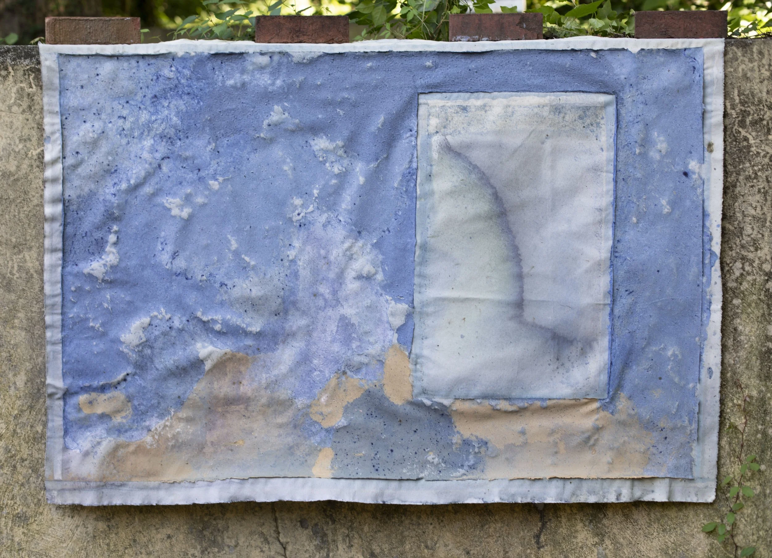 I set up a series of works involving paper pulp made from a mixture of abaca, a fiber used in hand papermaking from the abaca plant native to the Philippines, and cotton linter, made from cotton seed. I tinted the wet pulp with litmus, a dye made from several species of lichen. Litmus is an Old Norse word meaning from moss. Litmus paper is used as a pH indicator: blue litmus paper turns red under acidic conditions, red litmus paper turns blue under alkaline conditions, and neutral litmus paper is purple. With my bucket full of these botanical bodies from all over the globe, brought together through agriculture, industry, and biopolitical invention, I introduced them to a Maryland backyard of native tulip trees, invasive kudzu, snails, beetles, moths, mosquitos, a derelict honeybee hive (the honeybees themselves a non-native agricultural import ) and the many other occupants of this stretch of earth and sky.