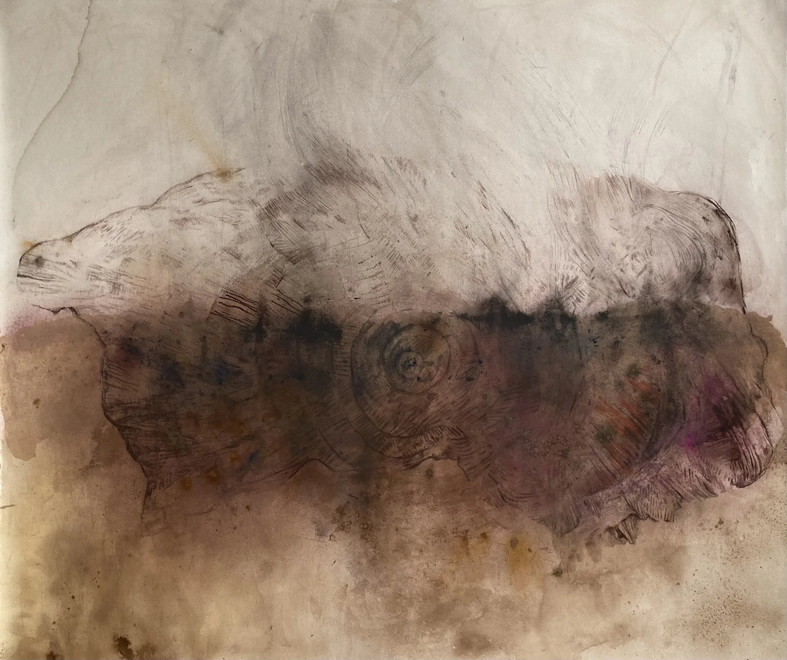 59” x 55”, sepia pencil, walnut ink, studio debris, mud, and rainwater on paper.