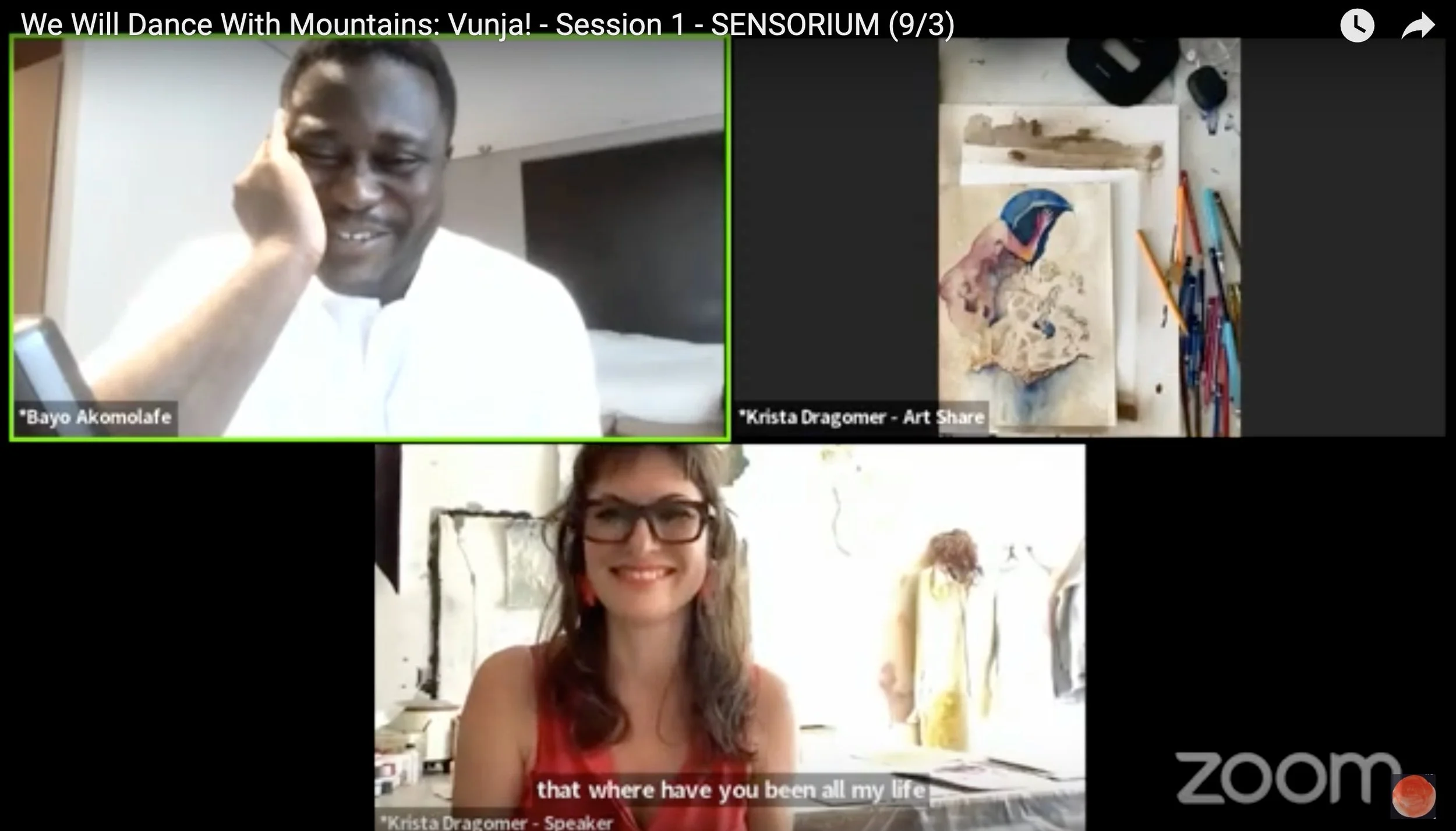 Krista was then invited to join the assemblage of co-creators and contributors to the 2023 of iteration of We Will Dance With Mountains: Vunja! an online post-activist worldwide course-carnival, creating on-camera live drawings, sensorial documents of the WWWWM convenings.