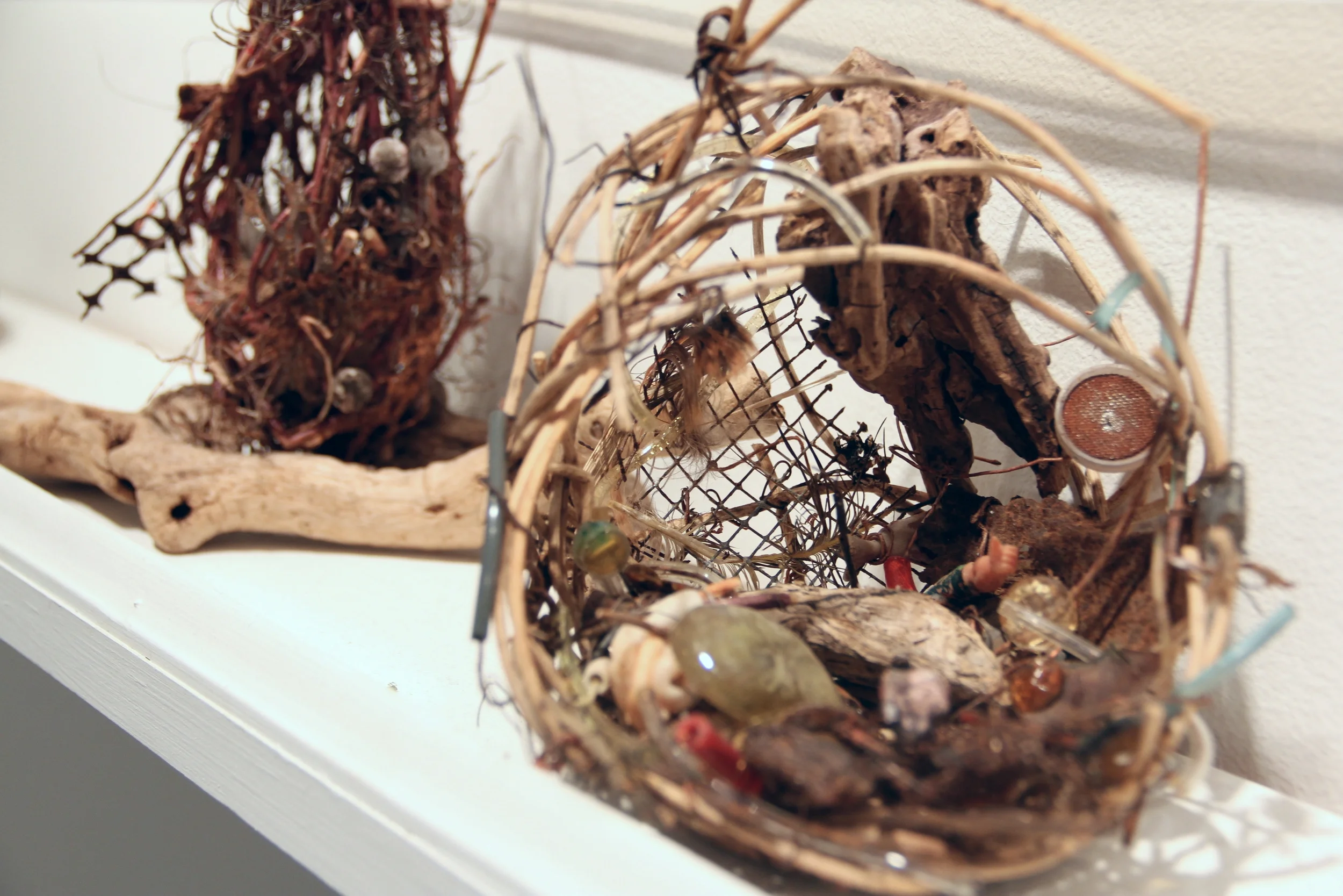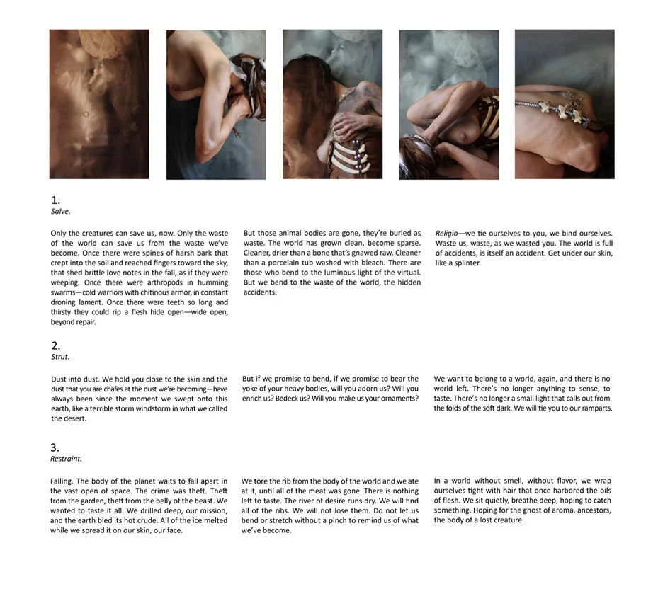 Exhibited at the Migrations group exhibition at Proteus Gowanus, a gallery at the intersection of art, citizen science and local ecology archives, We Break Down Ourselves evokes the strains of a future nostalgia that clings with evangelical fervor to the waste products and animal remains of a mythical past --the current present-- where biodiversity and limitless forms of object production are still living realities. Here, as has been the case so many times in the past, the female body becomes the site on which these holy objects of strange desire are ritualized, revealed, discarded, and cast off.The title of this 4-way collaboration comes from a line in Rainer Maria Rilke’s eighth “Duino Elegy”: